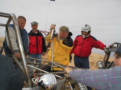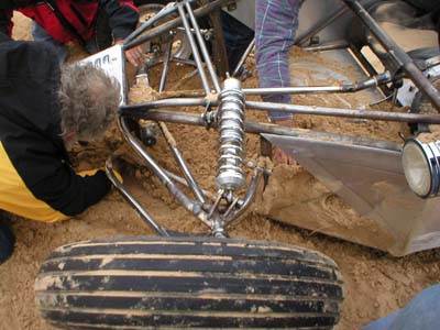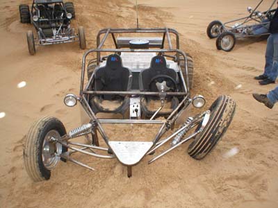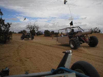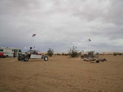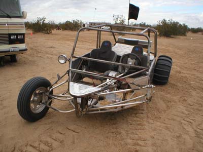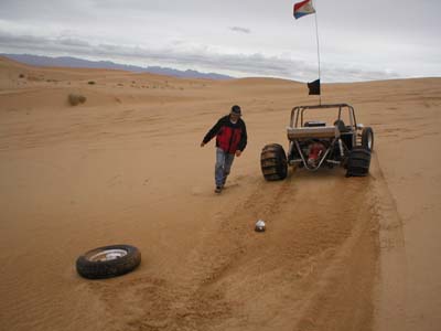On Monday morning's ride, Dean Carver's throttle stuck and he hit a rather large hole pretty hard. The new car held up well, but a shock rod end broke, causing some a-arm damage. Then after repairing the a-arm, (and adding the black flag) the spindle axle sheared off. No problem, he was willing to drive it as a three wheeler, but the right rear tire just spun, so John ended up towing the car back, with Barry as a very busy counterweight, steering the car from the passenger seat! |