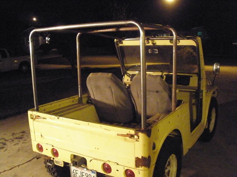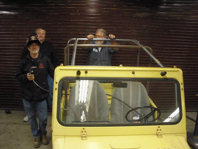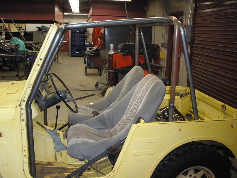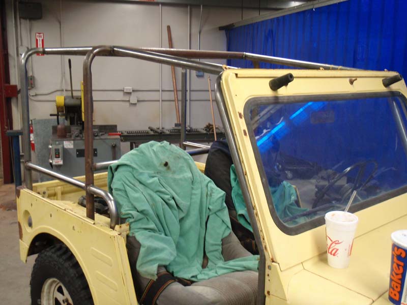 11/4/08: Tonight the LJ returned to the high school, this time being flat towed. With John, Dean, Jim, and Dave's help we got a great start on the roll cage. We got all three main bars bent and tacked together. Next time we will make the mounting plates and do the finish welding, as well as add a couple of more bars to support the cage. |