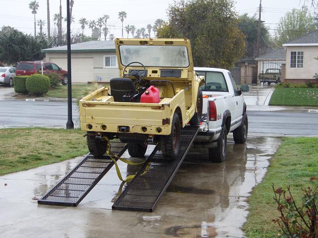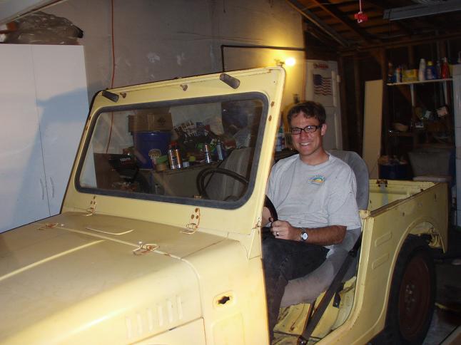 2/24/08: Here I am unloading the LJ from the truck, which was made slightly trickier by the fact it didn't have working brakes. After a little time adding an ignition switch, checking fluids, and bleeding the brakes it made a short trip around our front yard. Check out the video on You Tube by clicking here. It seemed to smoke just a bit, huh? Welll it tended to flood out too. After working on the carburator, I got it to run much nicer, as shown in the video here. |