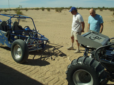 Kris and Doug had some spindle trouble on Monday, but the club came through and they drove the car on three wheels back to camp after using a ratchet strap to compress the right rear and having Don's car hooked to a tow strap to steer the car. They should have a new spindle on the car and ready for a mid March trip. |