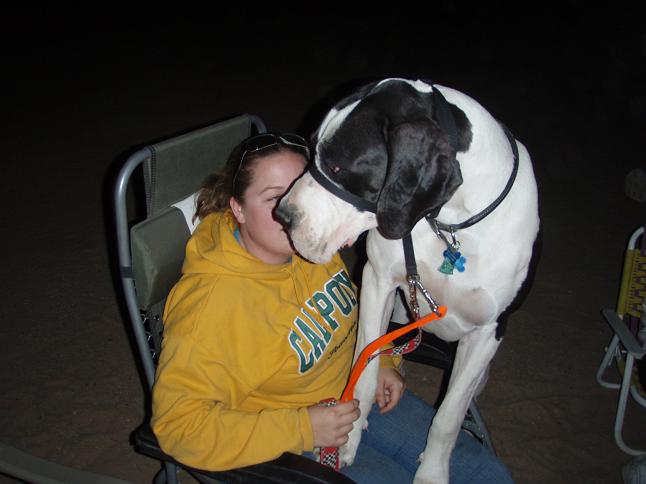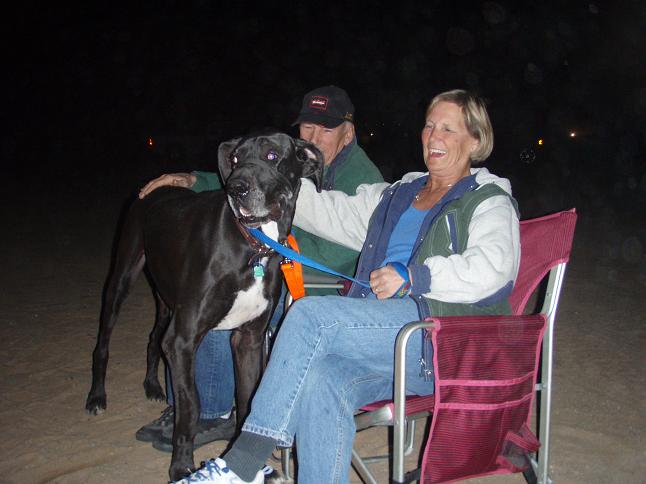 The boys at the campfire. Diesel thainks he's a lap dog and Tiny tries to adopt the Fords. |