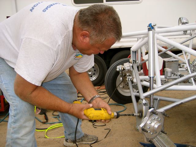 Some minor repairs at the workbench. Jim straightened a steering arm while Dale worked on his car and Jeff helped out. |